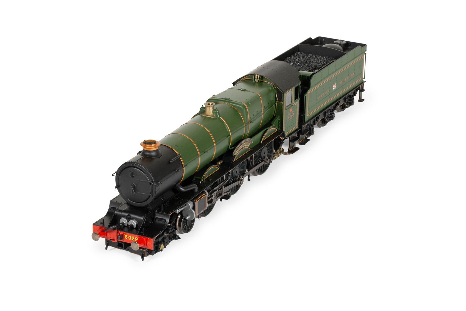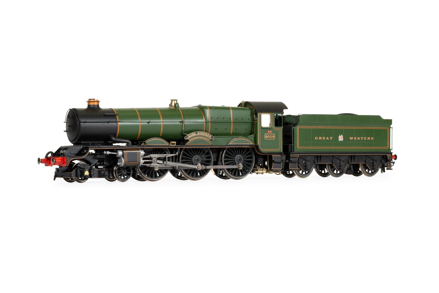 A vibrant GWR green livery is applied on this regal model, suited to the King Class of locomotives, along with its coupled tender. Two etched nameplates of ‘King Stephen’ can be applied to the chassis, just above the wheel. Please be aware that this is not suitable for children. This model is DCC-ready and is compatible with our HM7000 21-Pin decoder. The accessory bag contains a vac pipe, a bar coupling, a hook coupling, two cylinder draincocks, a brake rod and a tender brake rod.