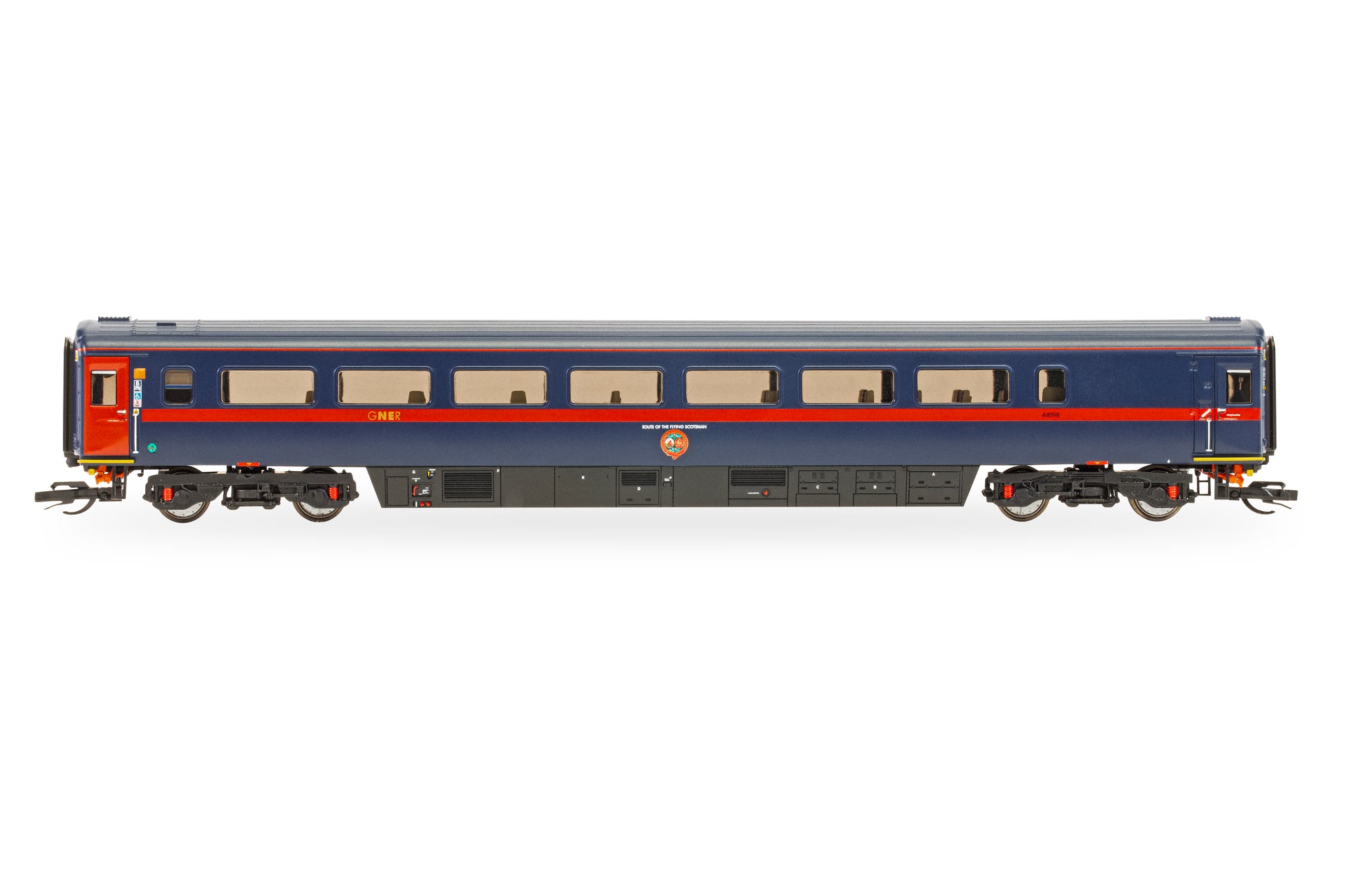Carrying the running number 44098, this coach was a key part of GNER’s HST sets, operating along the East Coast Main Line during the late 1990s and early 2000s. Finished in the striking deep blue and red GNER livery, this model showcases finely applied branding and crisp detailing, staying true to the appearance of the original Mk3 TGS.